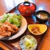 定食にはサラダ、小鉢、漬物、味噌汁、ご飯が付いています。